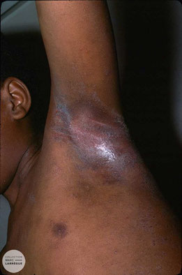Sous l'effet du grattage, la peau s'épaissit très vite, plus vite que sur une peau blanche, mais le résultat est le même, la peau est épaissie et gratte encore plus. La peau s'épaissit en réaction au grattage, et la peau épaissie gratte. C'est un cercle vicieux. Il faut traiter la peau.